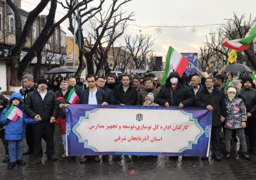 به گزارش روابط عمومی اداره کل نوسازی، توسعه و تجهیز مدارس آذربایجان شرقی، کارکنان این ادارهکل ضمن حرکت در کنار اقشار مختلف مردم، بار دیگر با آرمانهای امام خمینی(ره)، مقام معظم رهبری و شهدای گرانقدر انقلاب اسلامی تجدید میثاق کردند و با سر دادن شعارهای انقلابی، پایبندی خود را به ارزشهای نظام جمهوری اسلامی به نمایش گذاشتند.